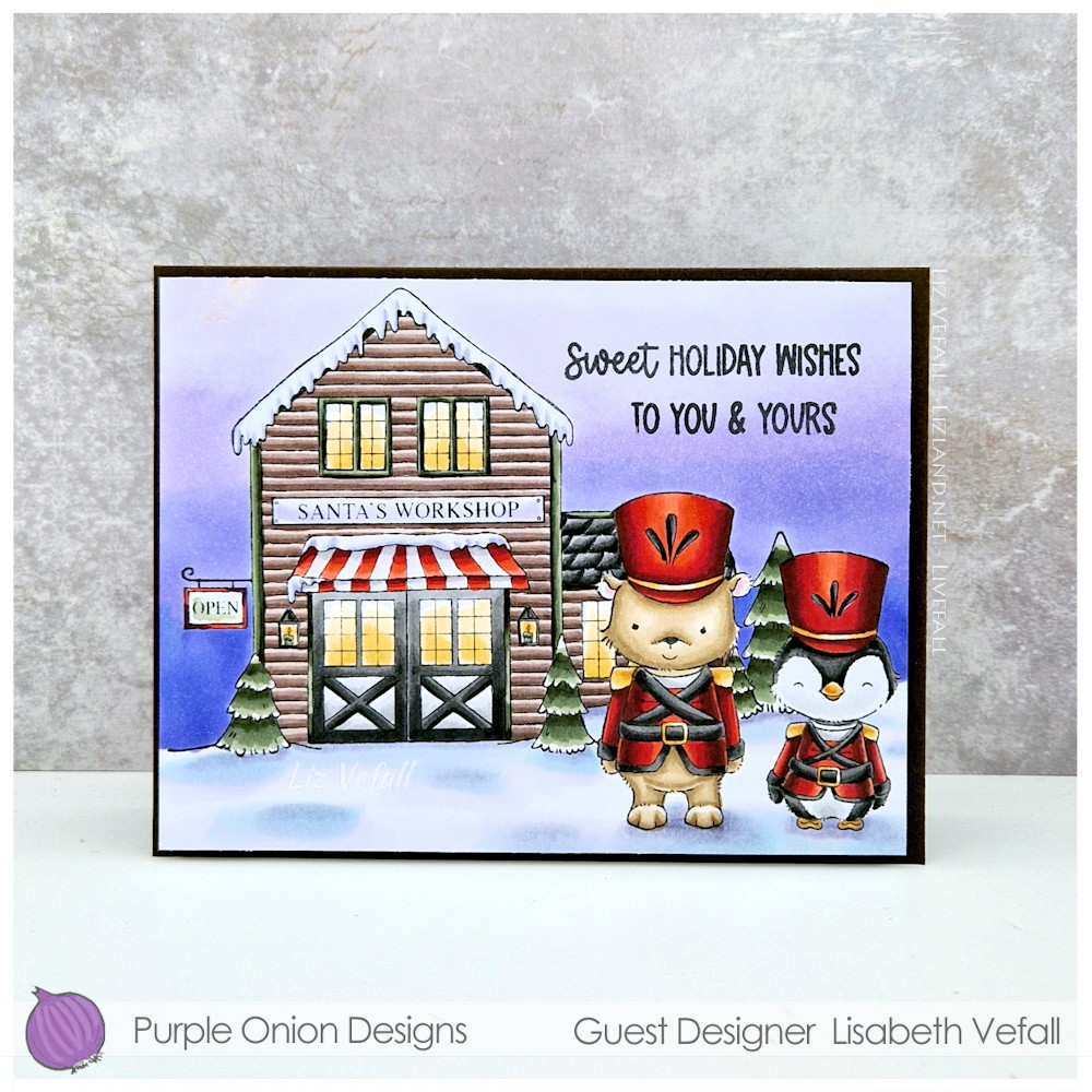 My second card for the Purple Onion Designs release has more of a Christmas theme than the first. Here you have animals dressed as nutcrackers (that’s what I’ve coloured them as anyway, I love The Nutcracker!) in front of Santa’s Workshop. The bear is called Graham and the penguin is called Tristan. The sentiment is from Santa’s Sentiments.